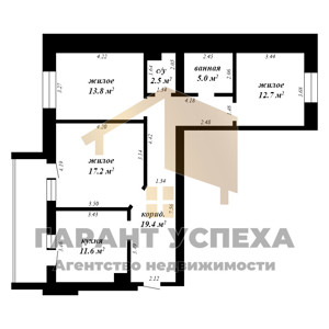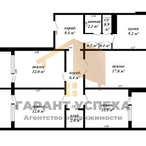 Общая площадь – 92,9 кв. м, жилая – 48 кв. м, кухня – 14,5 кв. м. Три изолированные жилые комнаты 18,2/14,9/14,9 кв. м. Раздельный санузел.