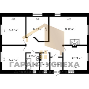 Общая площадь жилых помещений составляет 99 кв.м., жилая – 69 кв.м. В доме имеются 5 жилых комнат (одна из которых проходная), кухня площадью 11,3 кв.м, ванная комната, коридор, топочная. При желании, можно сделать перепланировку, при которой организовать из проходной комнаты и кухни совмещённую кухню-гостиную. А в помещении ванной не составит труда организовать совместный санузел. В доме имеется второй выход на участок с тыльной стороны.