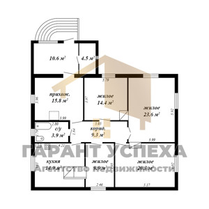 Общая площадь жилых помещений составляет 125,6 кв.м., жилая – 75,9 кв.м. В доме имеются три жилых комнаты, одна из которых просторная гостиная (32,4 кв.м) с действующим камином, и практически таких же размеров одна из спален. Помимо указанных помещений в доме есть большая кухня, два совмещённых санузла, две террасы, при этом одна полностью закрыта от непогоды, прихожая, тамбур и топочная. С тыльной стороны дома под террасой предусмотрен подвал площадью 20,3 кв.м.